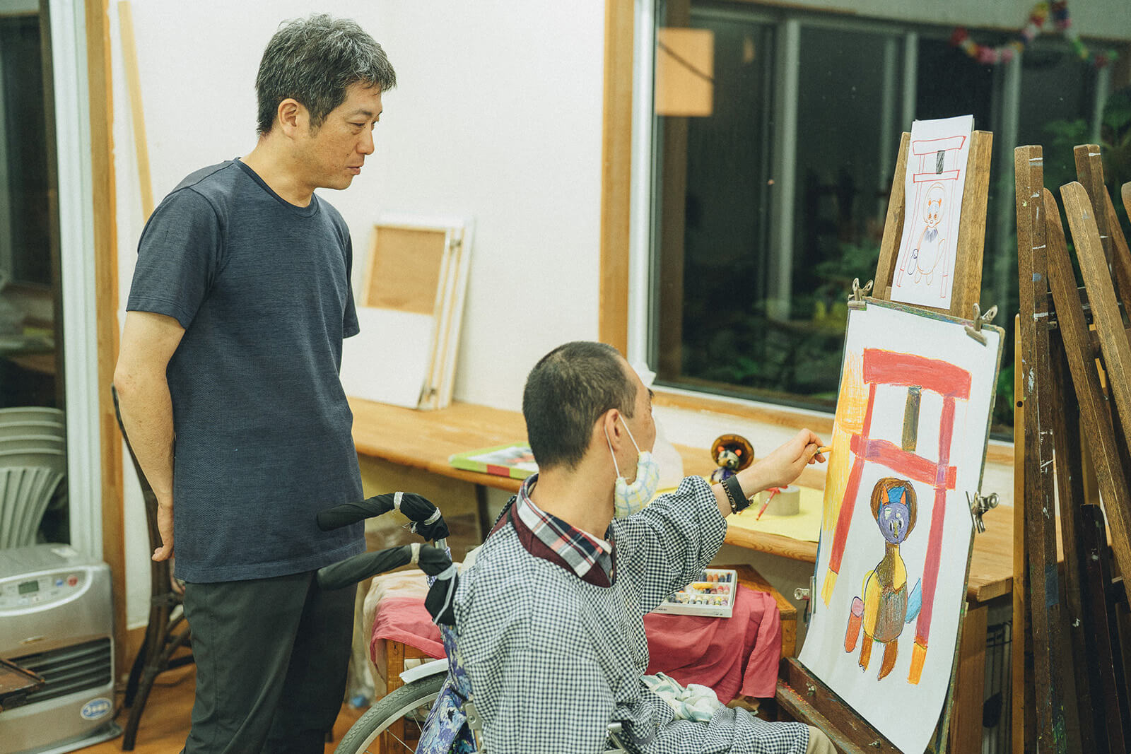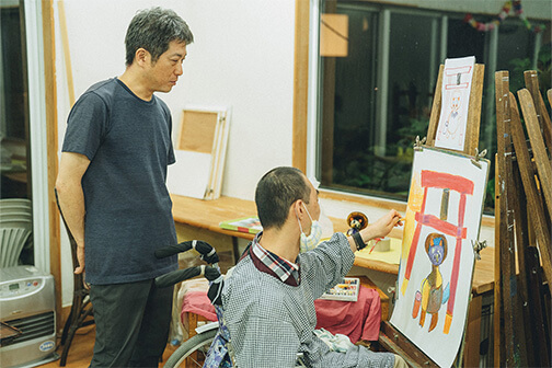 絵を描くことが日常になったのは、特別支援学校に通っていた頃のこと。美術の先生に勧められて絵画コンクールへ出品した作品が入賞したのがきっかけでした。それ以来、絵は欠かすことのできない生活の一部に。今では週に5 日福祉作業所に通いながら、金曜の夜は絵画教室で絵を描いています。