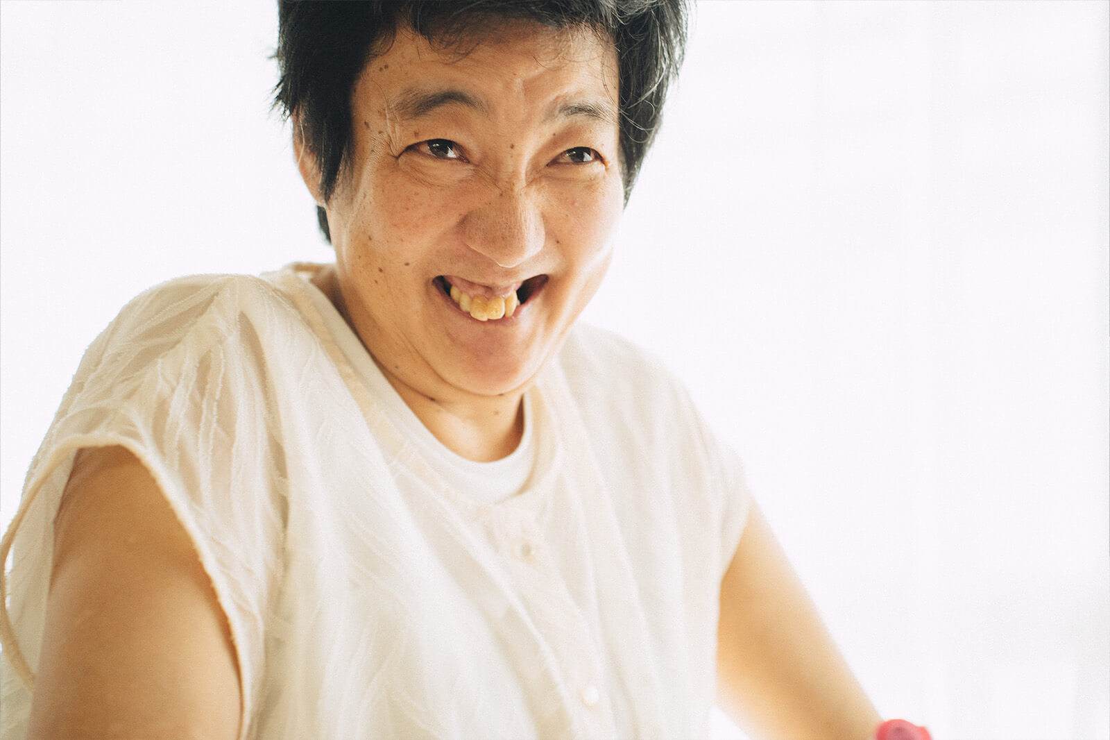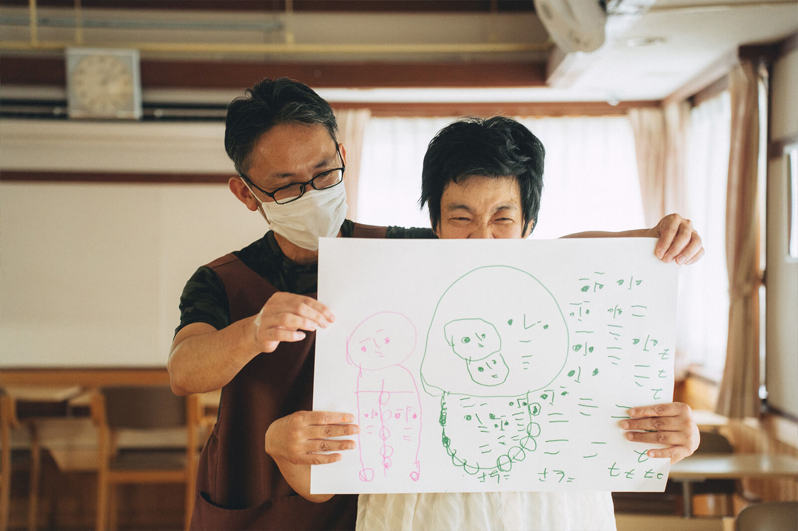 「こっちにおいで!」と、ちょっぴり強引に手招きをする彼女に笑顔で応えるのは、支援員の渡邉清野さん。22年にわたって佐智子さんの暮らしを見守り、アート活動のサポートもしてきました。