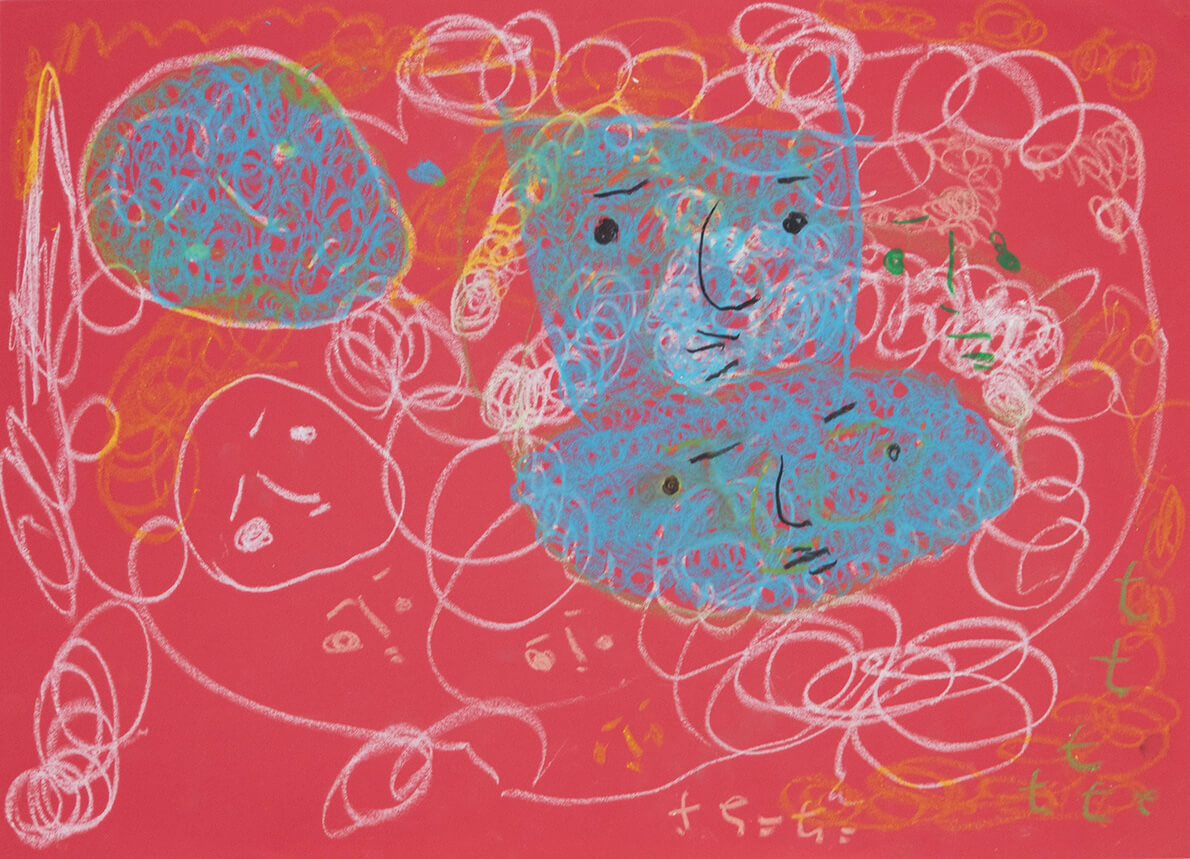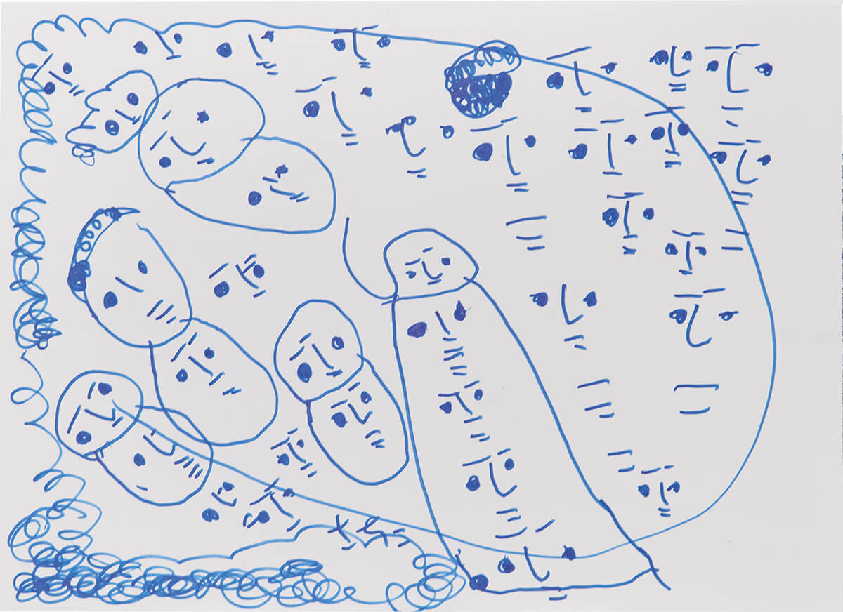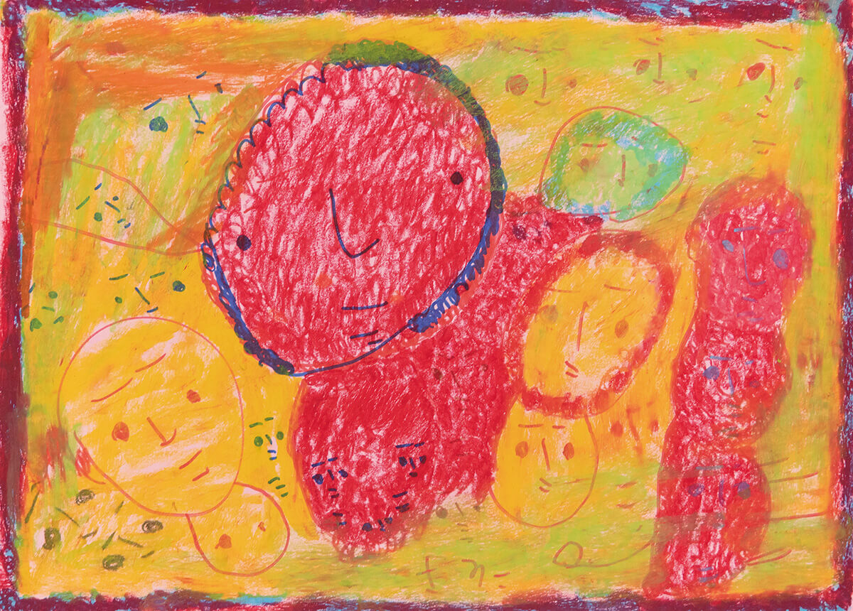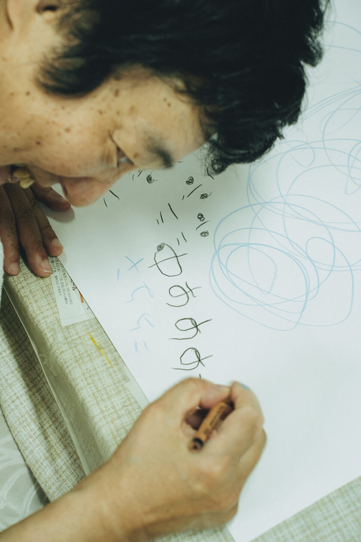そんな明るく天真爛漫な佐智子さんですが、机に向かいペンを握ると、すっかり静まります。色鉛筆、クレヨン、マジック、水彩など、様々な画材で描かれる彼女の世界。迷いなく線が走り出し、人の顔のようなテクスチャがいくつか描き込まれると、その隙間は“ある文字”で埋め尽くされていきます。
