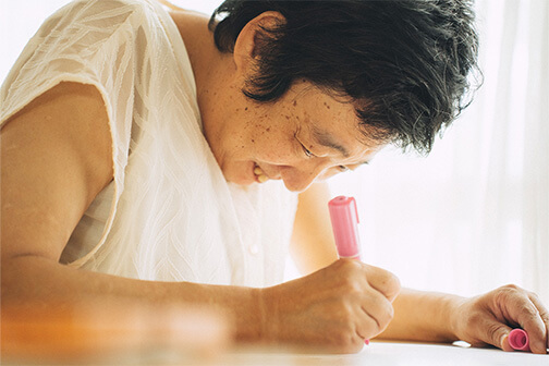 満足するまで描き終えると、真剣な眼差しをふっと緩ませ、照れくさそうに作品を見せてくれる佐智子さん。その笑顔を見ていると、ついついこちらまで嬉しくなってしまいます。壁に飾られた自分の絵をきらきらした目で眺める横顔も印象的でした。