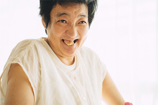 山梨県山梨市牧丘町の『そだち園』で暮らす湯泉佐智子さんは、心の中にある気持ちを、そのまま届ける人。嬉しければ喜びを全身で伝え、褒められたいときはまっすぐな眼差しを向ける。またお気に入りのスタッフさんを見かければ、ペンを手にしていても心ここにあらずになってしまうことも…。でも、描き上げた絵を抱えて小走りに近づき、ふっと恥ずかしそうな笑顔で差し出す姿は、まるで恋する乙女のようです。