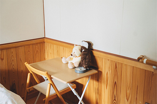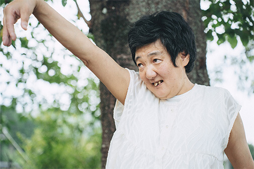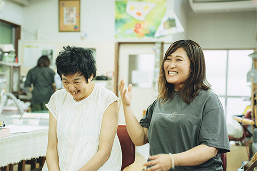 「こっちにおいで!」と、ちょっぴり強引に手招きをする彼女に笑顔で応えるのは、支援員の渡邉清野さん。22年にわたって佐智子さんの暮らしを見守り、アート活動のサポートもしてきました。