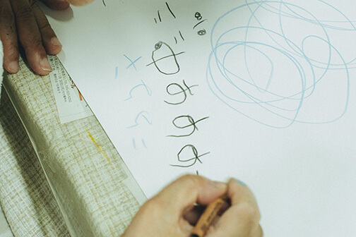 「この“す”は、大好きな弟さんの名前からとった一文字なんです」。渡邉さんに見守られながら描かれていく文字や人の表情の一つひとつには、揺れ動く刹那の感情が表れているよう。その集中力はすさまじく、彼女なりの完成を迎えるまでペンが止まることはありません。