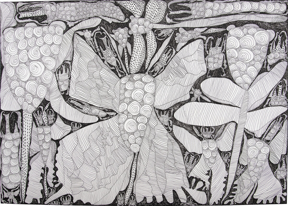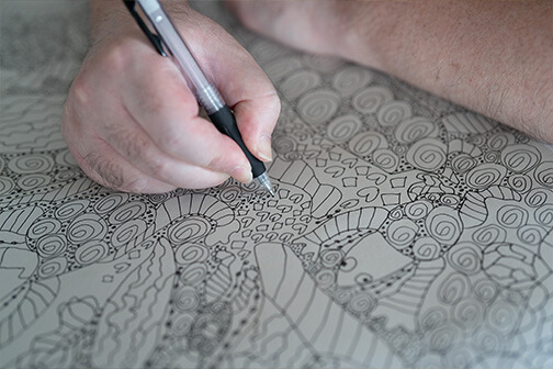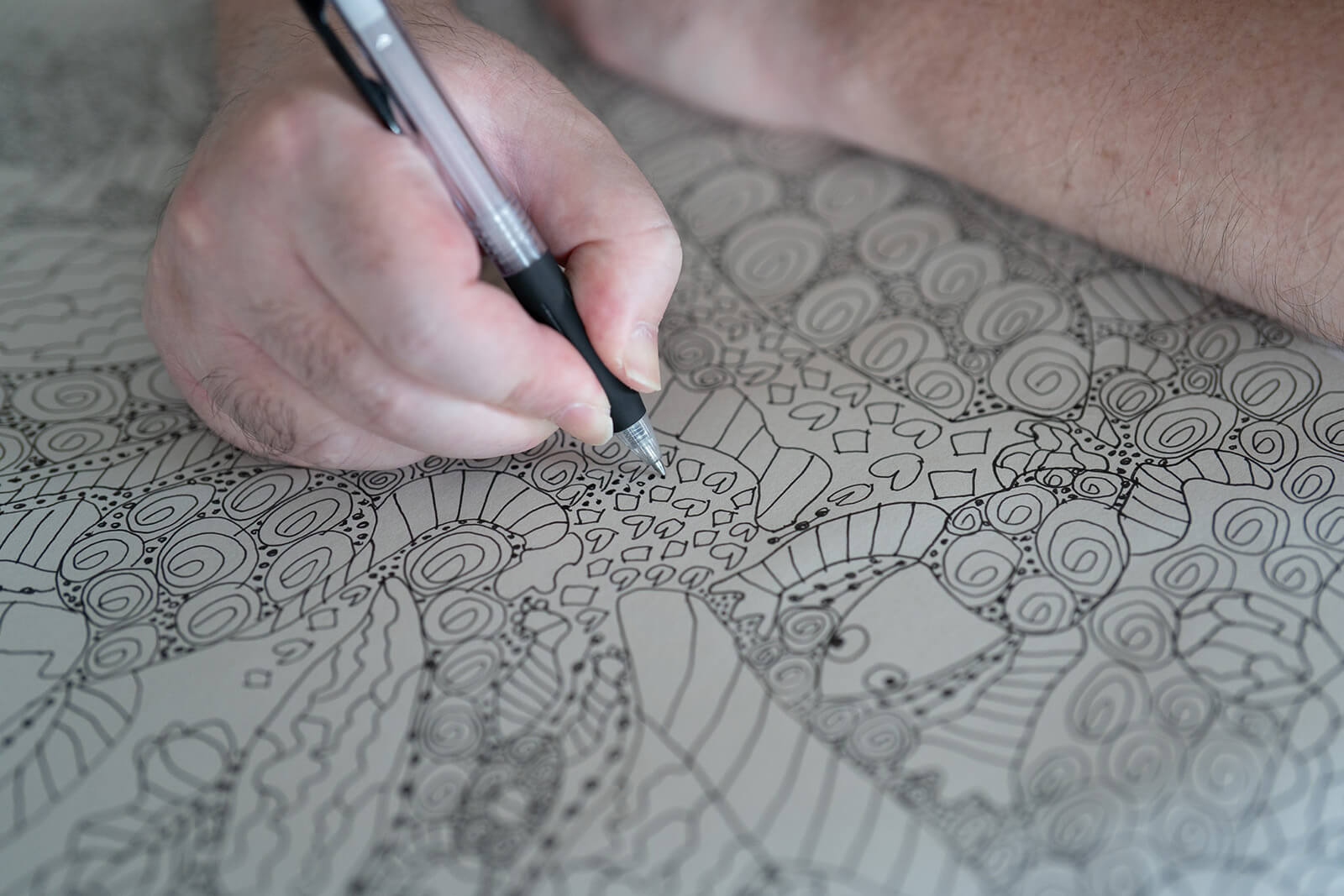 題材は人や動物などさまざま。愛用のSARASA・0.7mmボールペンで細かな線を一つひとつ丁寧に重ねていきます。最近は色鉛筆で彩色にも挑戦し始めたことで表現の幅がぐんと広がり、依頼での制作も増えているのだそうです。とりわけ人を描くのが好きなのだと、早川さんの問いかけに、小さな声で答えてくれました。