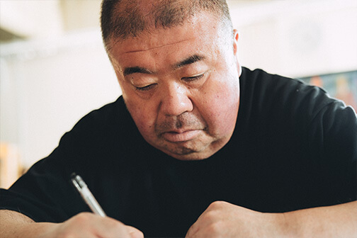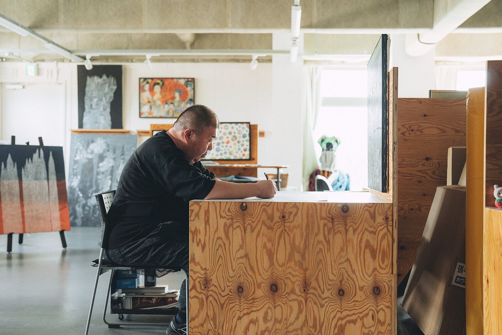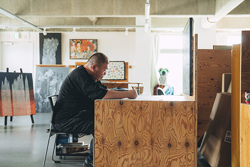 『社会福祉法人やまなみ会』が運営する『やまなみ工房』の一室に、岩瀬俊一さんの作業机があります。2008年からこの場所に通い、今では毎日ペンを手に創作へ向き合う日々。けれど以前は、絵を描くこととは無縁の暮らしだったそうです。