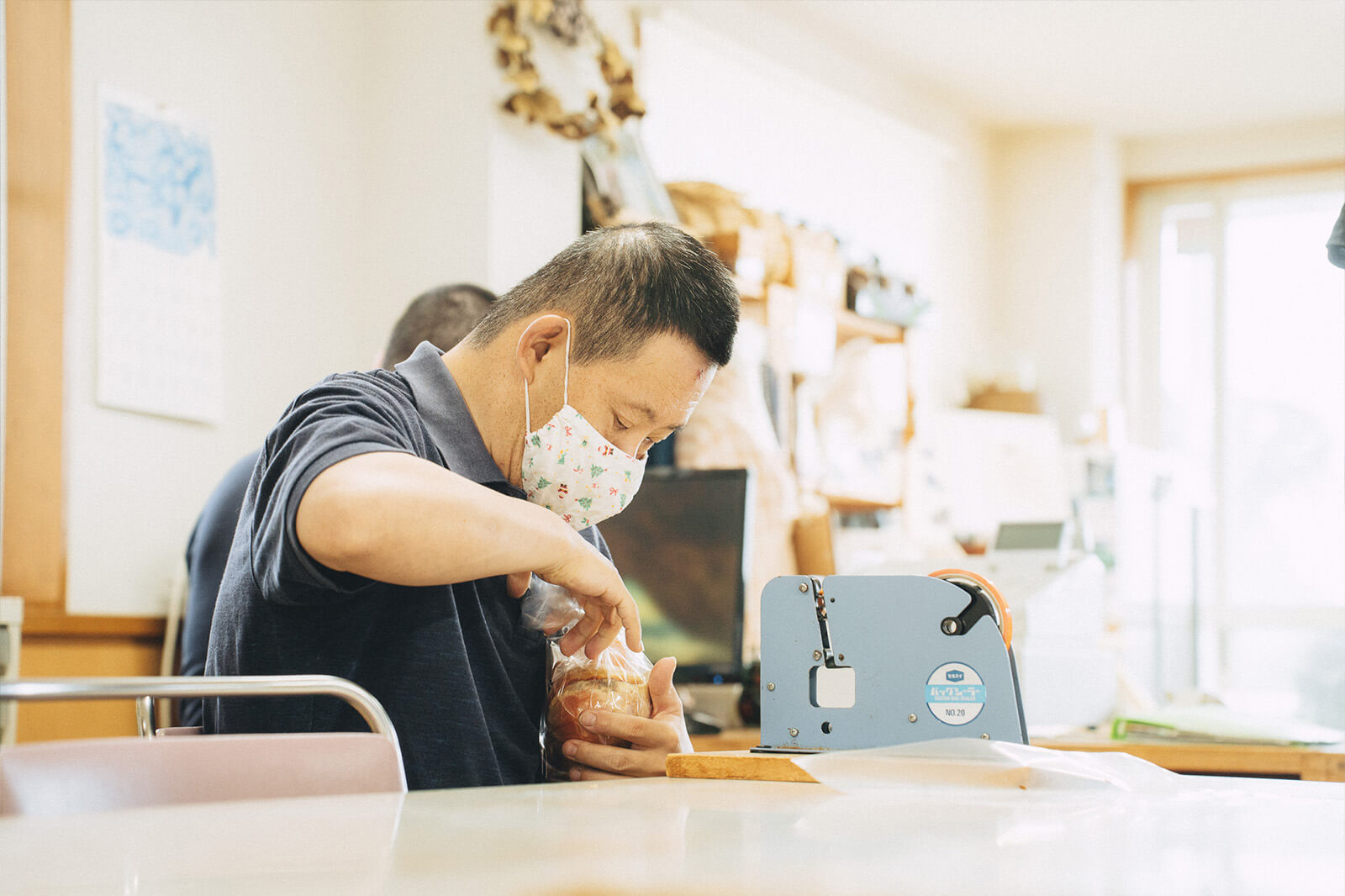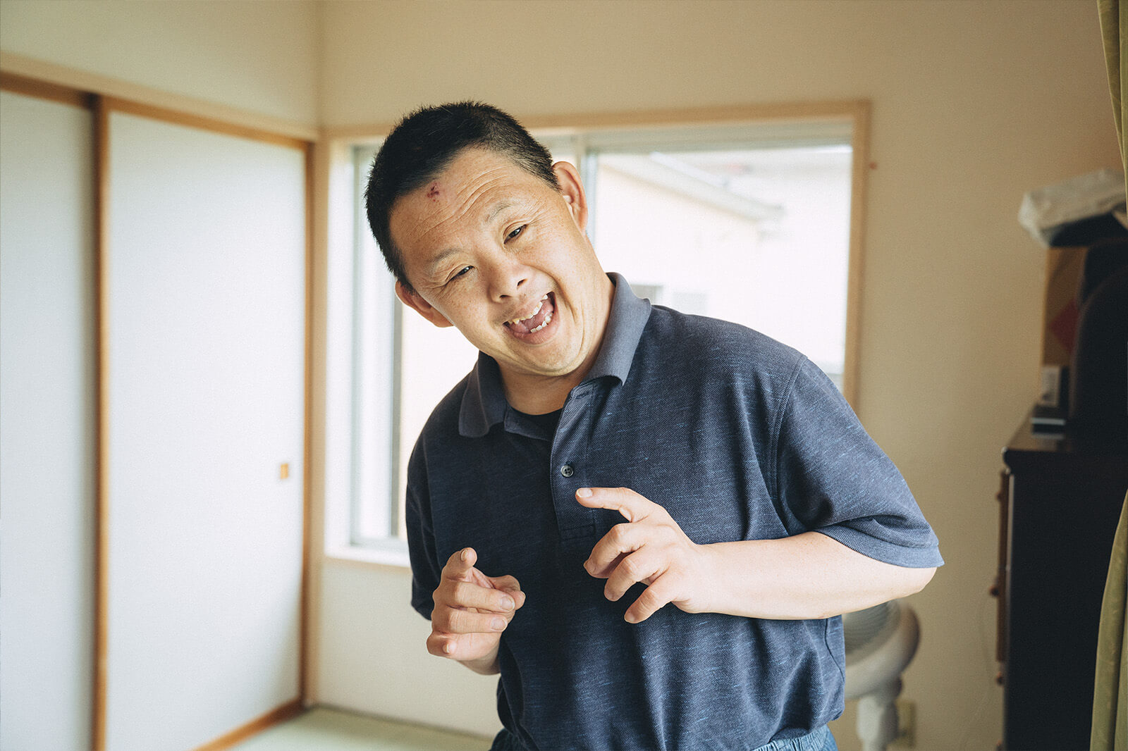 自身が掲載された新聞の切り抜きをこちらに向けながら、いつものくしゃっとした笑顔を見せる岳史さん。施設ではすっかり“お兄さん”の立場となったそうで、「ふみと、がんばるよ」と、年下の利用者さんに言葉をかけるなんとも頼もしい姿もありましたが、やっぱりこの表情こそが、たけちゃんの魅力ですよね。