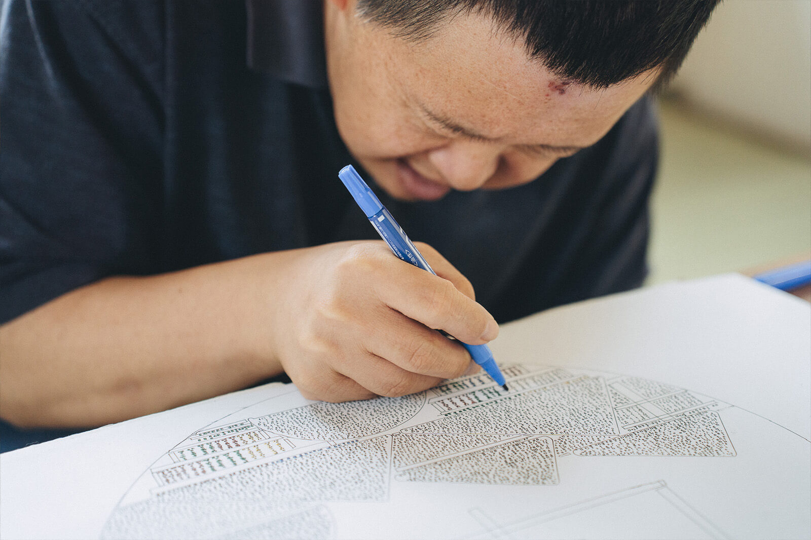 岳史さんがここに来るのは週に5日。そのうち月、火、金曜日は自分たちで育てた野菜の袋詰めなどの作業を行い、残りの日は丸一日絵を描きます。まずは紙の上にフライパンの蓋を乗せ、シルエットに沿って大きな円を描くと、CD、定規など、身の回りの道具を使い円や三角を描き込んでいく。それらで円の中がぎっしり埋め尽くされると、やがて色が彩られていきます。