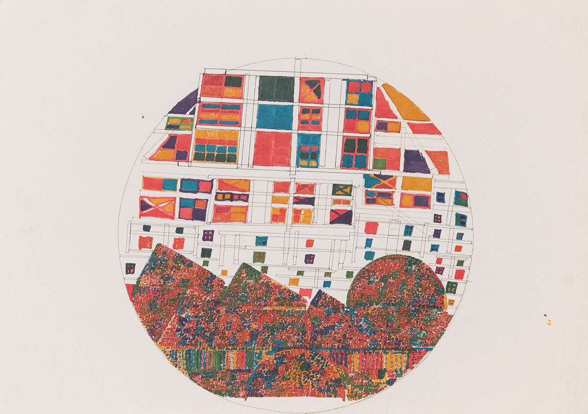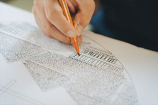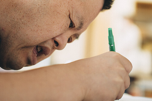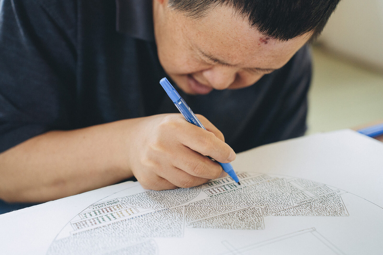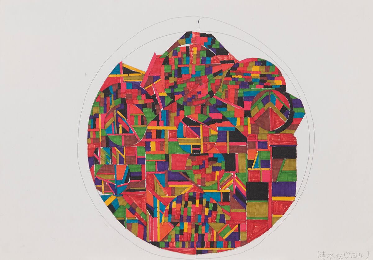岳史さんがここに来るのは週に5日。そのうち月、火、金曜日は自分たちで育てた野菜の袋詰めなどの作業を行い、残りの日は丸一日絵を描きます。まずは紙の上にフライパンの蓋を乗せ、シルエットに沿って大きな円を描くと、CD、定規など、身の回りの道具を使い円や三角を描き込んでいく。それらで円の中がぎっしり埋め尽くされると、やがて色が彩られていきます。