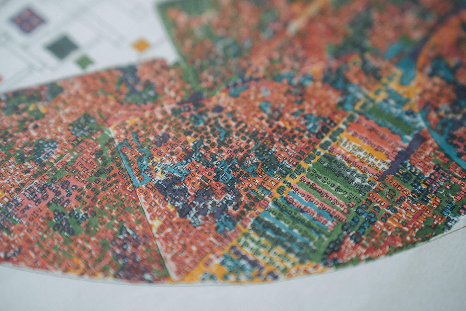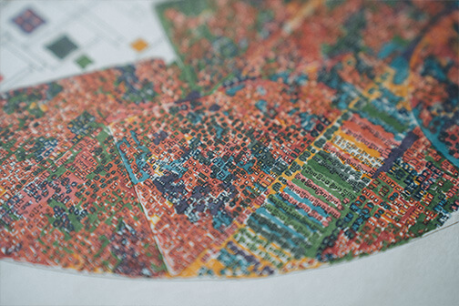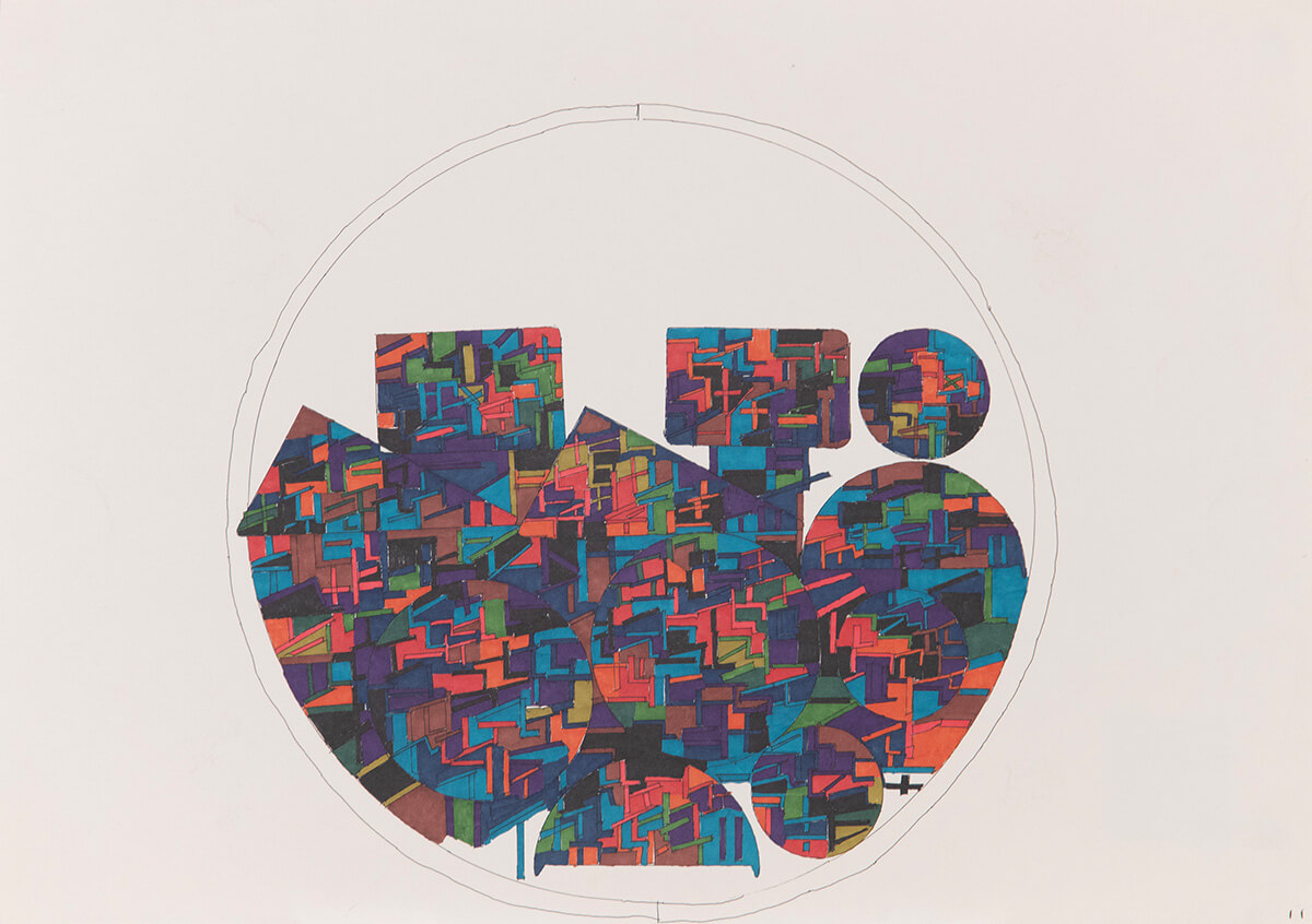 最近の制作では色づかいや精密さに磨きがかかる一方で、びっしりと図形が詰まっていた円に少し余白が残されるように。もしかしたら年齢を重ねる中で、少しずつ制作へ向き合う姿勢も変化してきたのかもしれません。でも、それがまた見る人の想像力を掻き立てる魅力になっている。近年では甲州市勝沼町にあるワイナリーのワインラベルに作品が採用されたり、河口湖のホテルや、大手コーヒーチェーン店に絵が飾られたりと、多方面に活躍の場を広げているのだといいます。