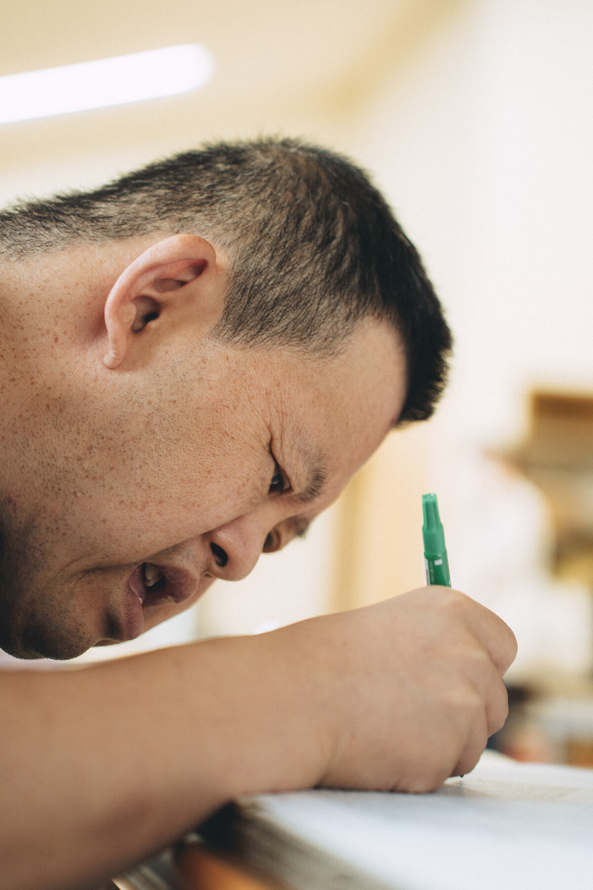 自身が掲載された新聞の切り抜きをこちらに向けながら、いつものくしゃっとした笑顔を見せる岳史さん。施設ではすっかり“お兄さん”の立場となったそうで、「ふみと、がんばるよ」と、年下の利用者さんに言葉をかけるなんとも頼もしい姿もありましたが、やっぱりこの表情こそが、たけちゃんの魅力ですよね。