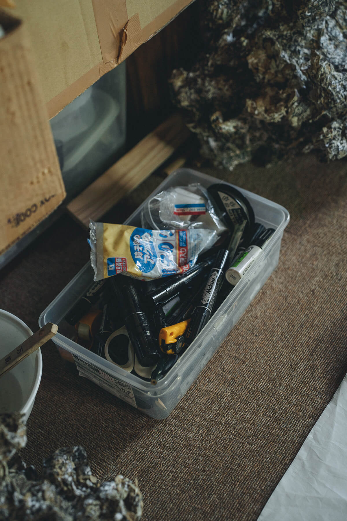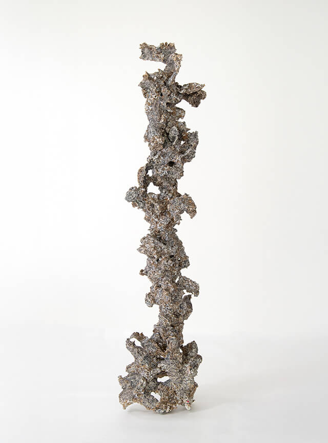 「“終わり”という考えがないんです」。描き足し、貼り足し、そして描き直す。その繰り返しのなかで、作品は日々、少しずつ形を変え、生まれ変わり続ける。立体作品もまた同様に、ちぎった紙をのりで固め、線を重ねて形づくられていきます。『線の生命体』と名付けられたそれは、絵でも彫刻でもない、けれど確かに“生きている”形を成している。