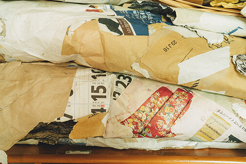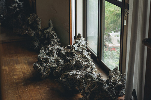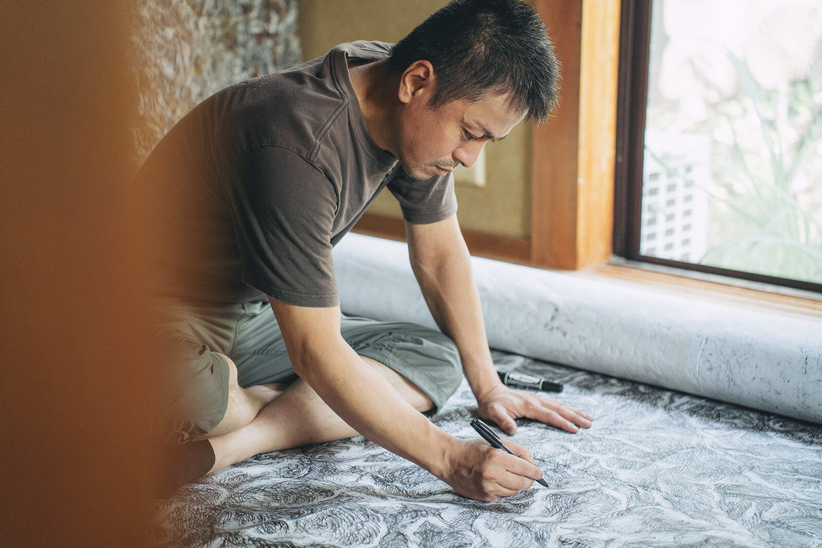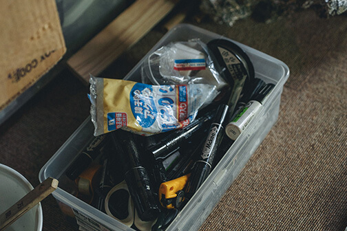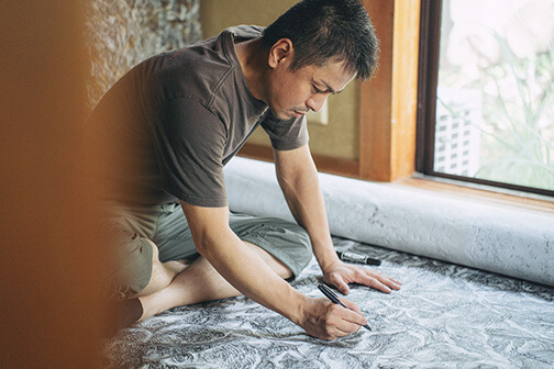 「描いているというよりは、描かされてると感じる時があります」 彼のキャンバスは、広告の裏や紙袋の切れ端など、日常に埋もれていた紙たち。つなぎ合わされたそれらは、黒々とした線で覆われ、どこまでも這い回るように広がっています。道具は油性ペン、ボールペン、墨。決して特別な材料を使っているわけではありません。それでも、三科さんの手にかかると、それらはまるで生命が宿ったかのように、ゆっくりと息をし始めるのです。