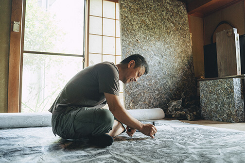 畳の上に広げられた大きな巻物の端に、三科琢美さんは、ぽつんと座っていました。まるで紙に吸い寄せられているかのように。背筋をわずかに丸め、じっと一点を見つめたまま、手だけが滑るように動いています。ペン先と紙が擦れる音が、わずかに響く静かな部屋。その姿は、何かに取り憑かれたようでもあり、何かを手繰り寄せているようでもありました。